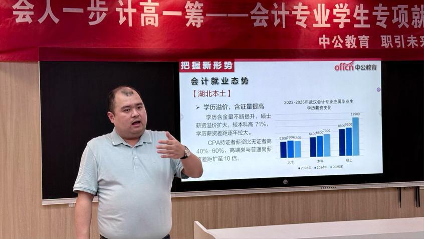 讲座首日,杨琪老师首先开场主持,为整场讲座奠定良好基调。随后,胡沿林老师上台讲话,鼓励在场学生在就业竞争中主动出击,积极把握机遇。接下来,诸葛老师从教育的根本任务出发,结合详实的数据对比,深入分析当前就业形势,并特别针对湖北省本土的会计人才需求与就业环境进行精准解读,为同学们勾勒清晰的就业全景图。