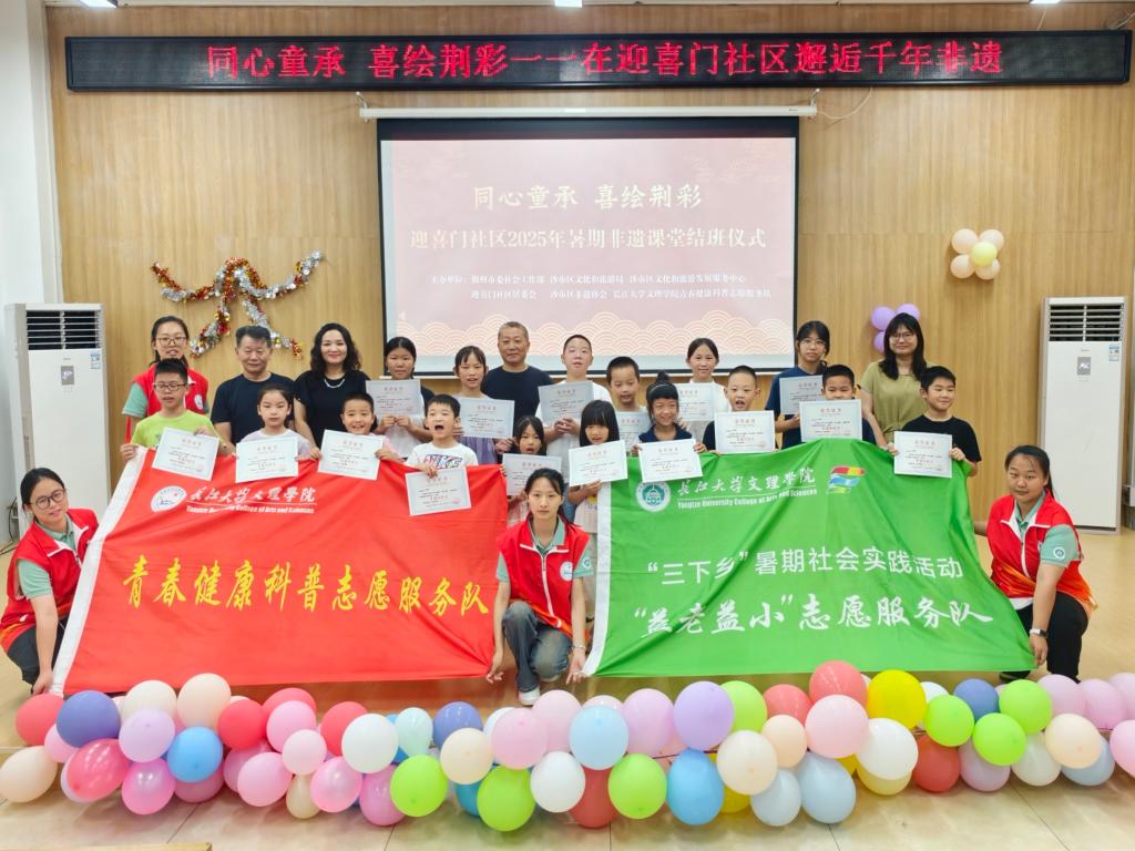 “我宣布,迎喜门社区2025年暑期‘同心童承,喜绘荆彩’非遗学堂正式结营!”在龚箐书记的宣布声中,全场响起持久的掌声。随后,学员、家长、志愿者与领导们齐聚舞台,拉起“全讯800cc大白菜官网青春健康科普志愿服务队”与“益老益小'志愿者服务队”,在镜头前留下充满意义的大合影。