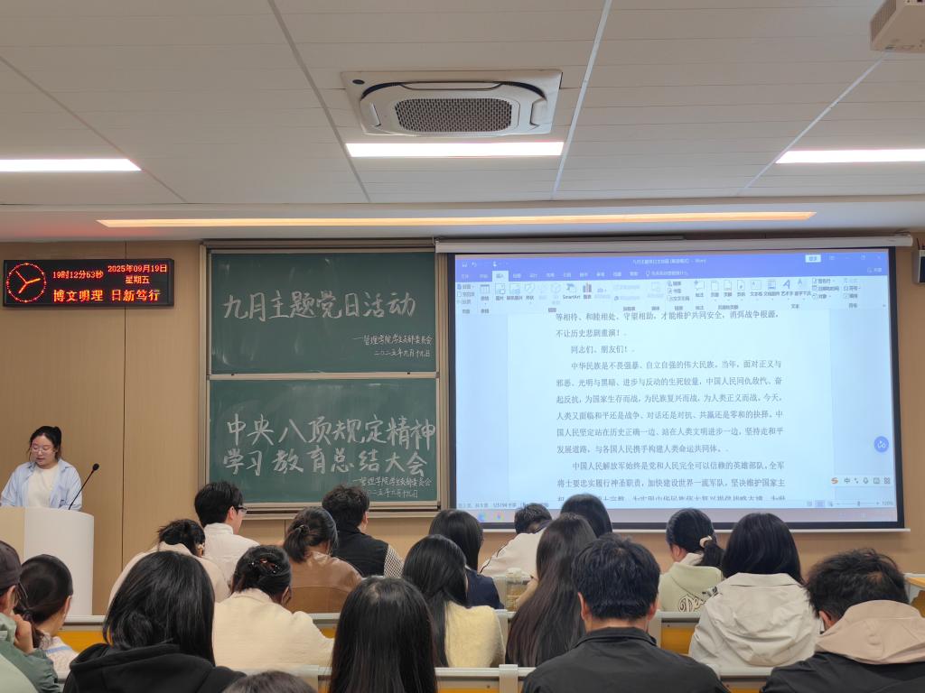 本网讯(通讯员黄江琴)管理学院学生党支部于9月19日晚19:00,在教学楼A402召开九月主题党日活动,管理学院全体党员参加。此次会议的学习主题是“巩固拓展学习教育成果,推进作风建设常态化长效化”。会议由汪李雨涵同志主持。