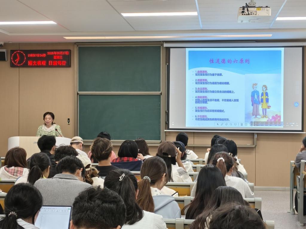 讲座中,侯霁峰老师首先通过详实的数据呈现中国健康指数的演变趋势,深入解读健康中国战略的核心要义。她强调:“生殖健康不仅关乎个人生育健康与生命质量,更对全面提升人口素质、推动社会文明进步、助力健康中国战略落地具有不可替代的重要意义。”随后,侯老师结合生动案例与通俗语言,系统科普了世界避孕日的起源、避孕的主要种类、科学原理、适用场景、正确使用方法及注意事项,内容兼具专业性与实用性,为学生们搭建起系统的生殖健康知识框架。讲座尾声,侯老师呼吁青年大学生以本次讲座为起点,主动学习科学避孕与生殖健康知识,树立“自我健康第一责任人”意识,将健康理念融入日常生活。“这次讲座让我收获满满,不仅补上了生殖健康知识的‘必修课’,更学会了如何通过科学方式保护自己,增强了自我防护能力。”参与活动的学生小孙分享道。