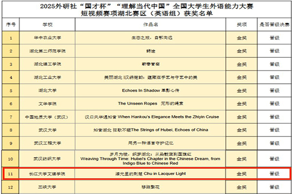 本网讯 近日,在纳入《全国普通高校大学生竞赛分析报告》竞赛目录的权威赛事中,我们外国语学院学子凭借扎根荆楚文化的创新创作与扎实的跨文化传播能力脱颖而出,连获多项省级重要奖项,其中2项作品将代表湖北晋级国赛。