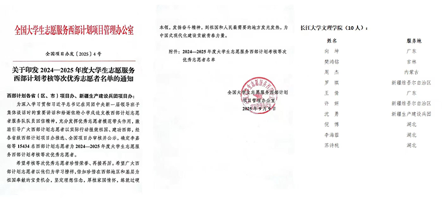 本网讯 近期,全国大学生志愿服务西部计划项目管理办公室印发《关于印发2024—2025年度大学生志愿服务西部计划考核等次优秀志愿者名单的通知》,我们向坤、樊鸿铭等10名西部计划志愿者在2024-2025年度考核中获评“优秀”等次。这份荣誉既是对志愿者们服务奉献精神的充分肯定,也是我们坚持以“两康一训”为育人导向,落实立德树人根本任务的生动体现。