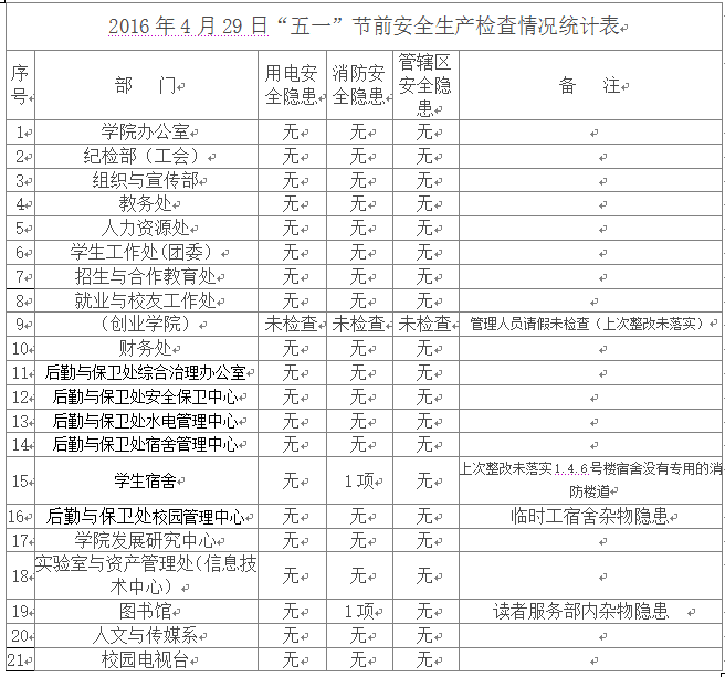 按照学院安全稳定工作领导小组的安排,4月29日,由安全稳定工作领导小组办公室组织学院院办、实验室与资产管理处、后勤与保卫处安全保卫中心、后勤与保卫处水电管理中心等单位,就全院“五一”放假前安全生产情况进行了检查,重点抽查是2016年1月16日检查中发现的安全隐患整改情况。