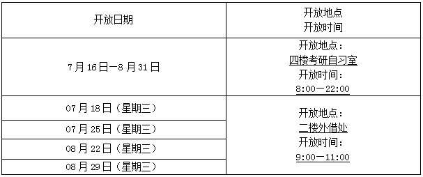 根据学院校历安排,结合图书馆工作实际,2018年图书馆暑假期间部分时间段开放, 具体开放时间如下: