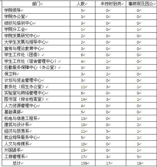 严格遵守工作纪律是学院对全体教职工的一项基本要求,本次考勤检查虽事先作了通知,但部分单位工作人员到岗情况仍不理想。学院要求有关单位责任人应进一步加强管理,规范请假报批制度和临时离岗登记制度,严肃工作纪律,维护学院行政办公、教学管理及学生管理工作秩序。本次检查暂不通报具体人员,后期人力资源管理中心将继续开展不定期抽查,对出现无故不按时到岗、中途脱岗、早退等现象的人员进行实时通报,并按有关规定予以处理。