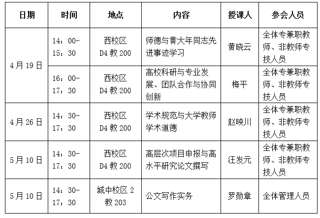 通过培训进一步提高教师师德师风修养,增强科学研究技巧,提升科学研究能力,强化团队协作意识和协同创新精神,进一步提高管理人员公文写作水平,强化公文处理能力。