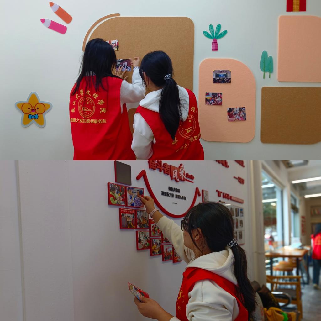 此外,志愿者还参与荆江驿站布置工作。大家分工协作,一组人整理驿站内的便民物资,将物品分类摆放整齐;一组人仔细张贴照片,为驿站营造温馨氛围;一组人擦拭桌椅、清扫地面,全方位改善驿站环境,为居民打造整洁、实用的公共服务空间。