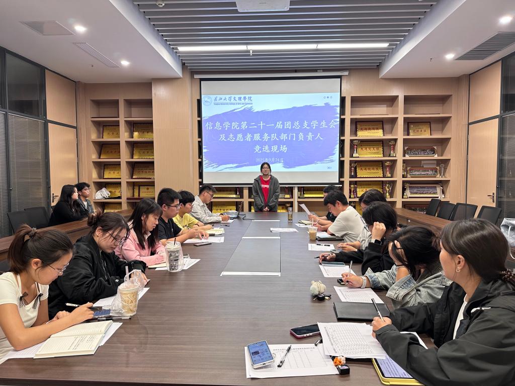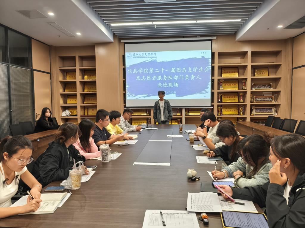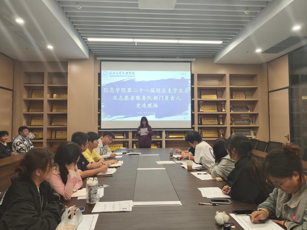 本网讯(通讯员 鲁盼)9月24日晚,学院第二十一届团总支学生会及志愿者服务队部门负责人竞选在图书馆510会议室举行。本次竞选旨在选拔一批能力突出、作风扎实的学生骨干,为学院团学工作注入新活力。党总支副书记王大专老师,第二十届团总支学生会主席团成员及第二十一届团总支学生会主席团成员出席活动并担任评委。