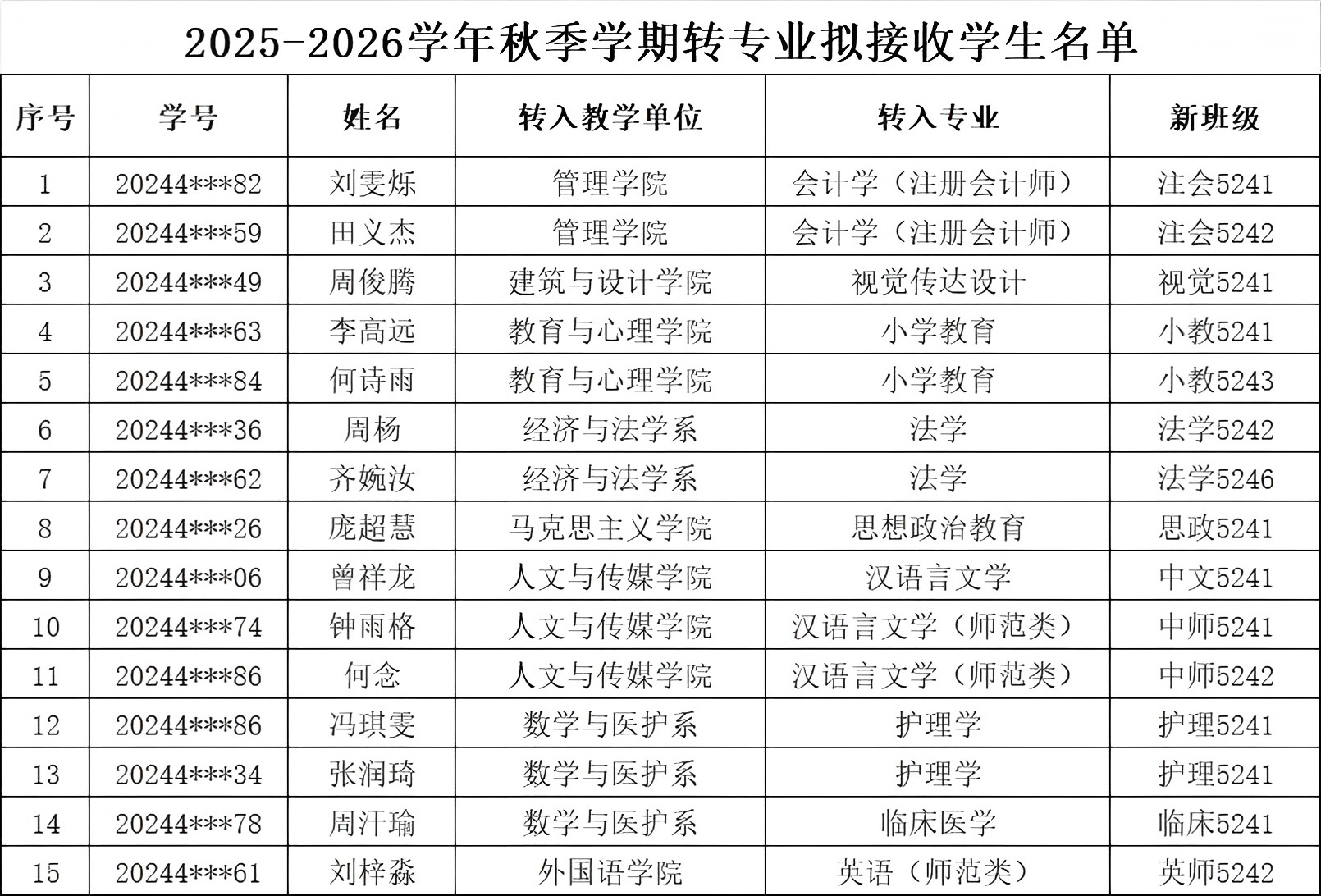 根据《全讯800cc大白菜官网专业分流与转专业管理办法》(文理行发〔2025〕21号)文件精神,按照转专业相关工作要求,经学生本人申请,招生处及所在教学单位审核,申请转入教学单位综合考核,教务处复核,拟同意刘雯烁等15名同学转入新专业学习,现将结果予以公示(见附表)。