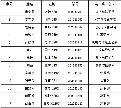 经个人申请、各院(系、部)推荐、学生工作部进行资格审查通过的13名候选人。具体名单如下: