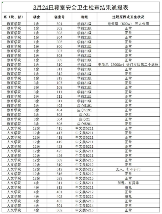 2022-2023学年第二学期第六周寝室安全卫生检查抽查结果通报