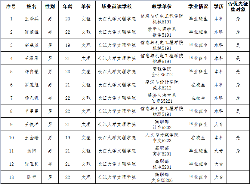 通过荆州区武装部组织的体检、政审考核、心理测试、役前训练等环节,我们王泽兵等13名同学经湖北省荆州市荆州区人民政府征兵办公室批准光荣入伍,现根据相关规定予以公示,公示时间为2023年3月13日至3月17日。如有异议,请在公示期内向学院纪检监察部或荆州区武装部进行反映。