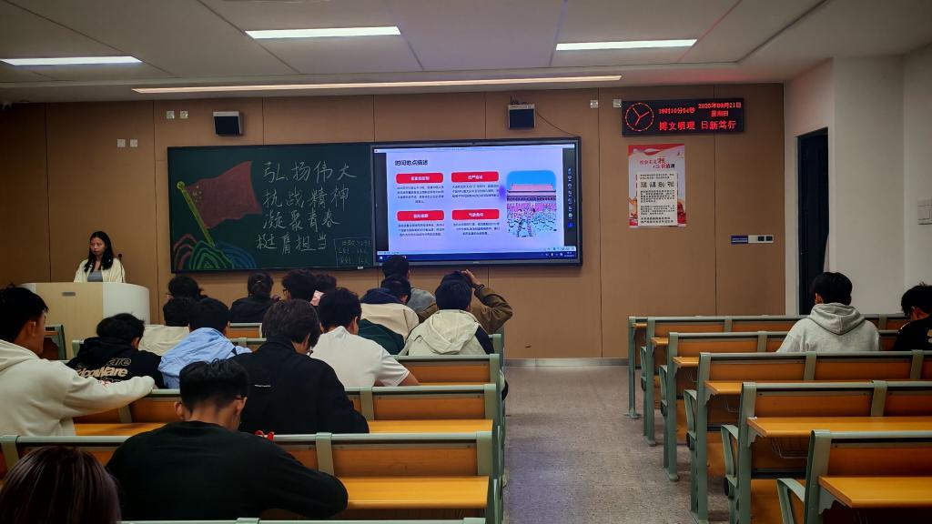 活动伊始,各班主讲人带领同学们共同学习了抗战历史的重要节点和英雄事迹,生动讲述了中华儿女在那段烽火岁月中展现出的天下兴亡、匹夫有责的爱国情怀,视死如归、宁死不屈的民族气节,不畏强暴、血战到底的英雄气概,百折不挠、坚忍不拔的必胜信念。随后,大家围绕如何将抗战精神融入日常学习与生活展开了热烈讨论,纷纷表示要以实际行动传承红色基因,勇担时代使命。