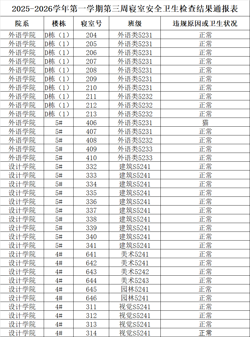 2025-2026学年第一学期第三周寝室安全卫生检查结果通报表