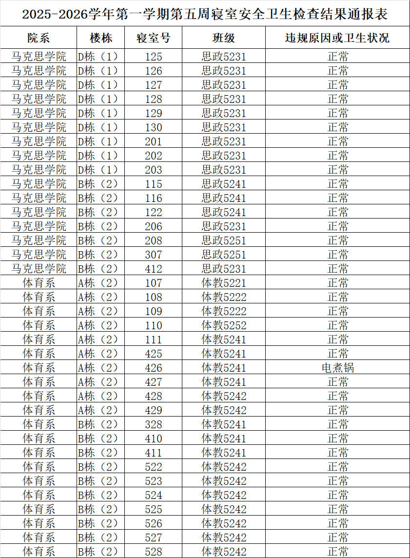 2025-2026学年第一学期第五周寝室安全卫生检查结果通报表